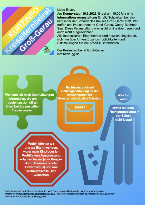 Der Kreiselternbeirat Groß-Gerau hat eine moderierte Facebook-Seite mit generellen schulischen Themen: www.facebook.com/kreiselternbeiratgg